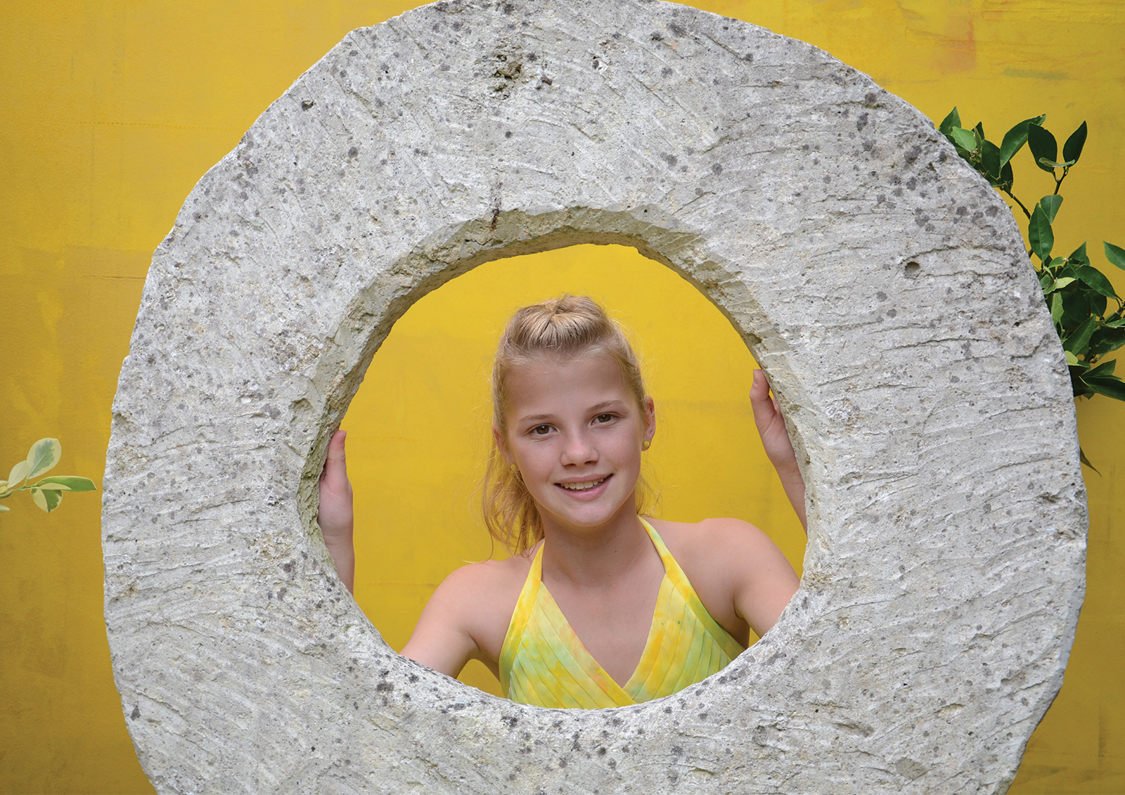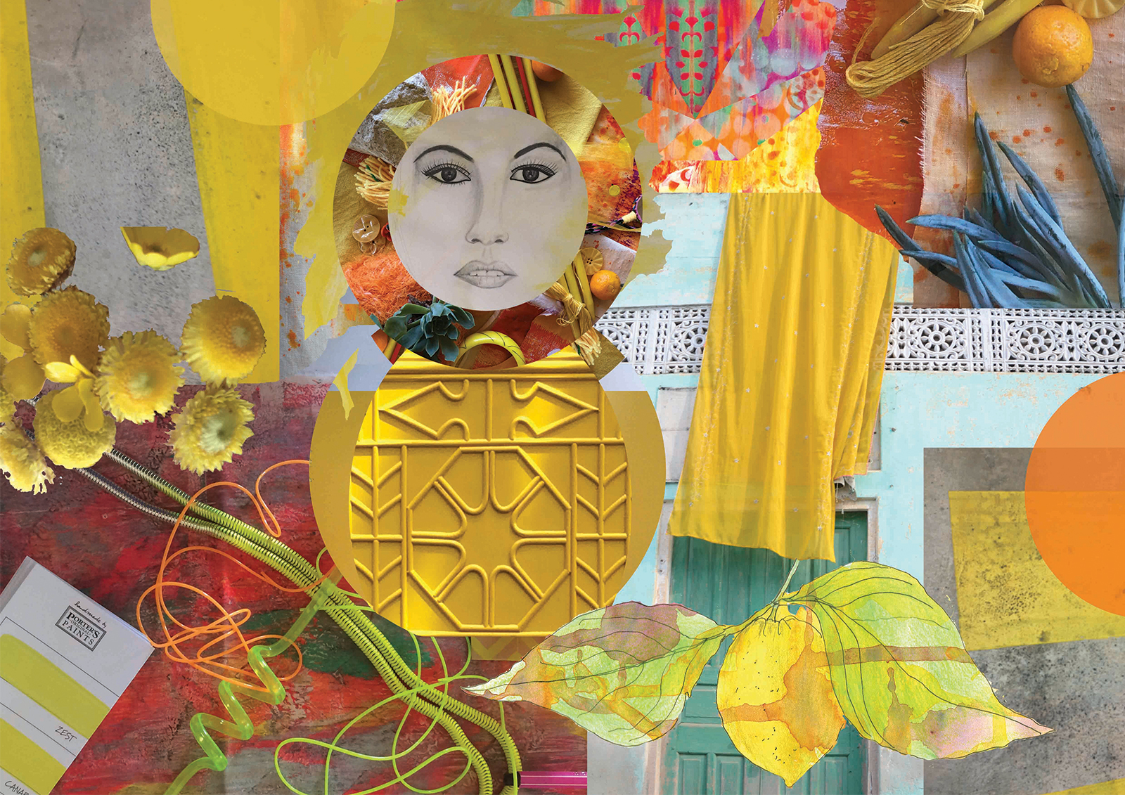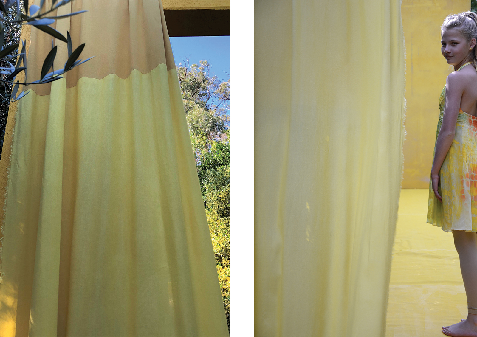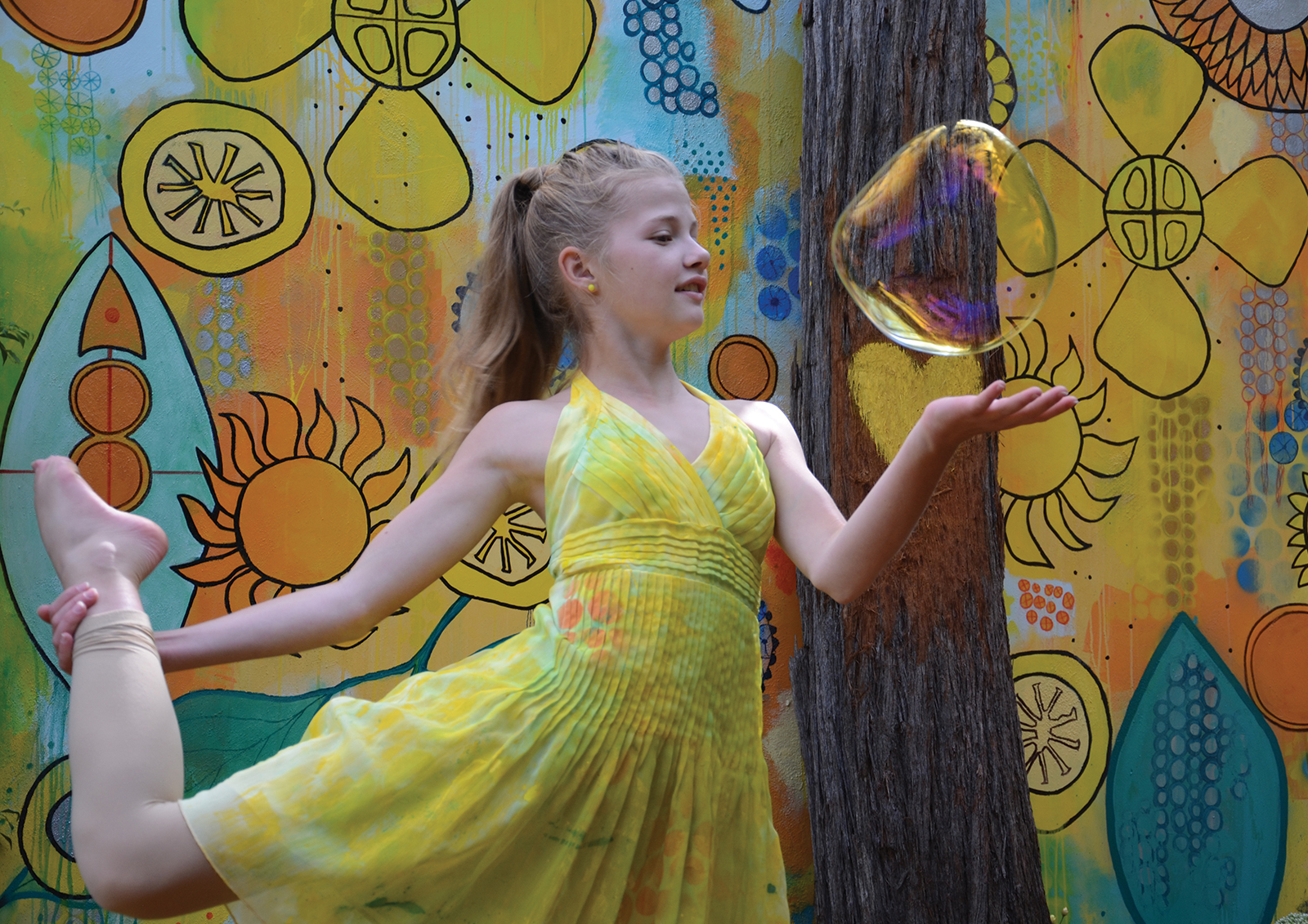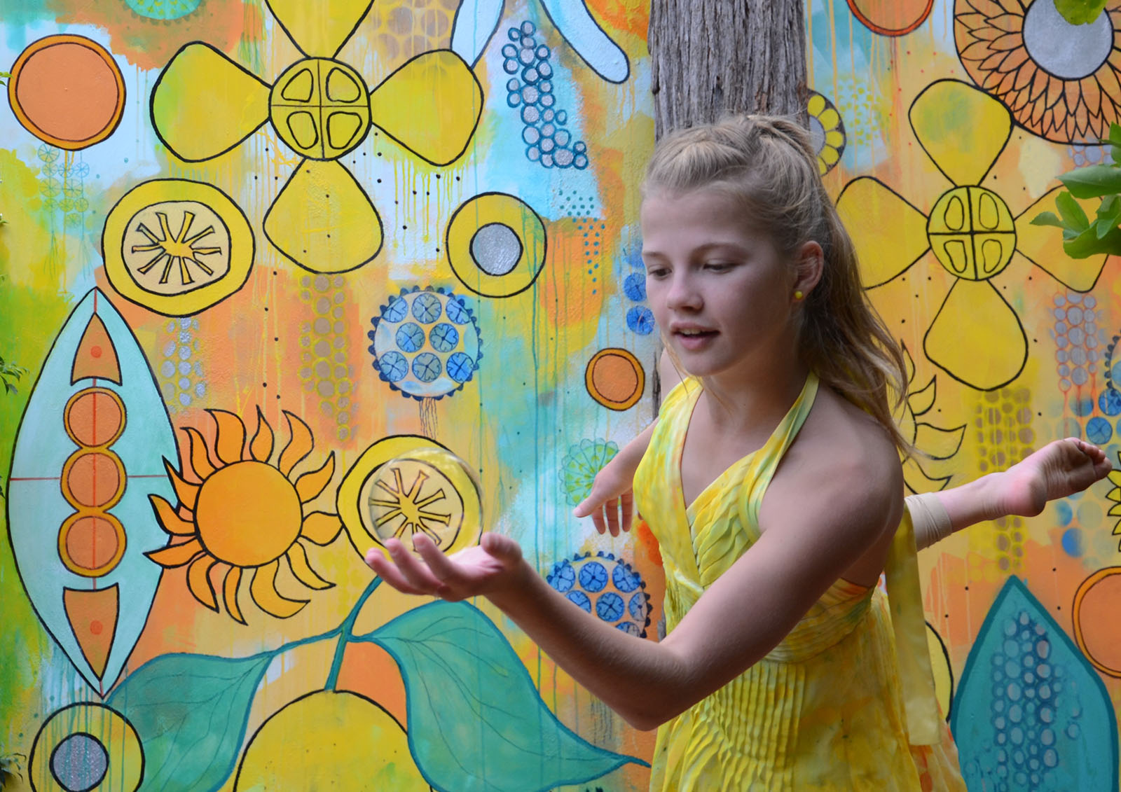 A unique garden room designed to evoke a mood of joy, happiness and energy. To articulate this mood, a colour palette of bright yellow, mid orange and light sky blue was selected. Distinct focal points are placed within the garden to add interest, draw the viewer in and up the pathway. These focal points are surrounded by established citrus trees – lemon, orange, mandarine, kumquat and lime, under-planted with everlasting daisies and succulents, and the pathway hedged with silvery stemmed bush germander. The visual story is of a gifted dancer who, on entering the garden is inspired to express her joy through dance and interactive play. The dancer is drawn up to the lineal bright yellow framed structure that invites the dancer in and to “follow the yellow brick road”. The frame and floor are draped with reclaimed, painted and natural dyed fabrics – these fabrics will be made into something beautiful. The fabric gently sways in the warm breeze waving the dancer in, where she runs, leaps, takes flight and twists her body with precision. Like a sweet, joyful bird, she interacts with the fabric, quick and fast movements up to and against the yellow textured wall. This is her stage. She is captured by a focal point, the hand-painted wall mural – an explosion of colour, botanical motifs, zesty circle slices, floating transparent balls, freshly squeezed paint and succulent greens. This visually stimulating artwork is yet another invitation to dance. Her soul delights as she gracefully and playfully moves rhythmically with the bubbles. Time to interact with the garden, as she places her happy face into the organic circular hole of the limestone sculpture, all set against a bright yellow textured wall. As the afternoon warm sun starts to filter, it is time to gather the citrus from the trees for home-baked delicious treats and to taste the lemon meringue pie – heavenly.