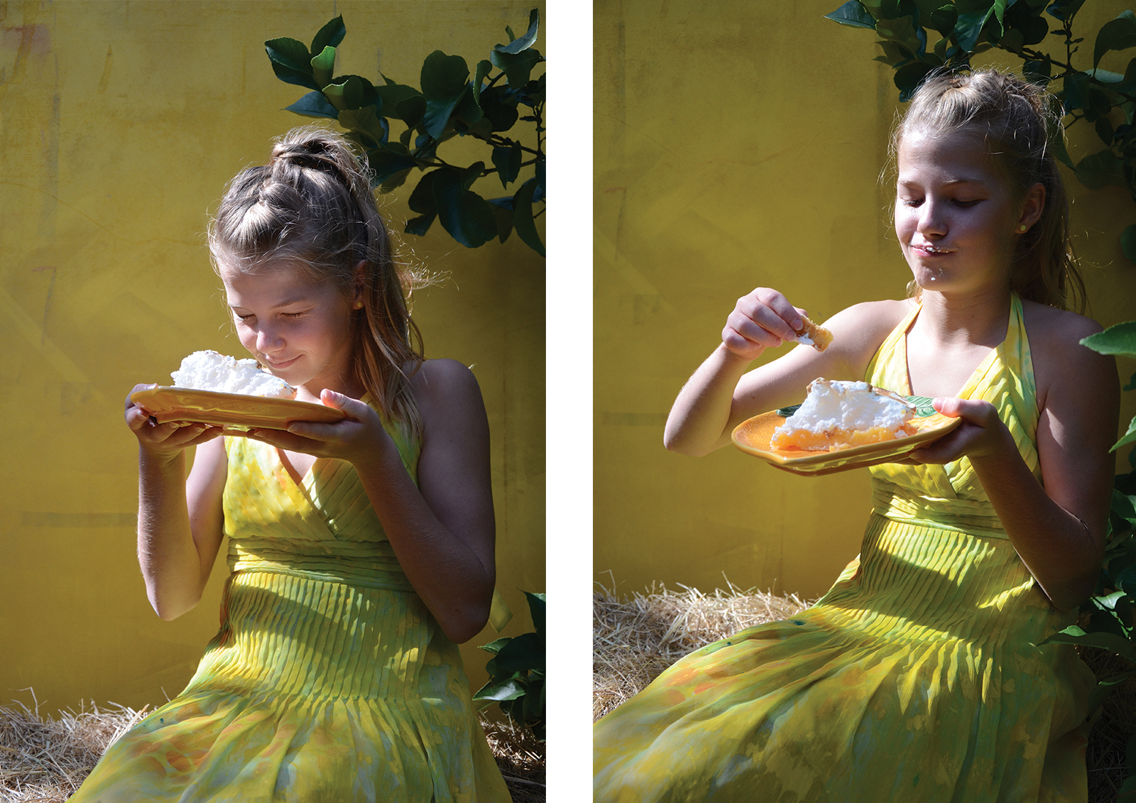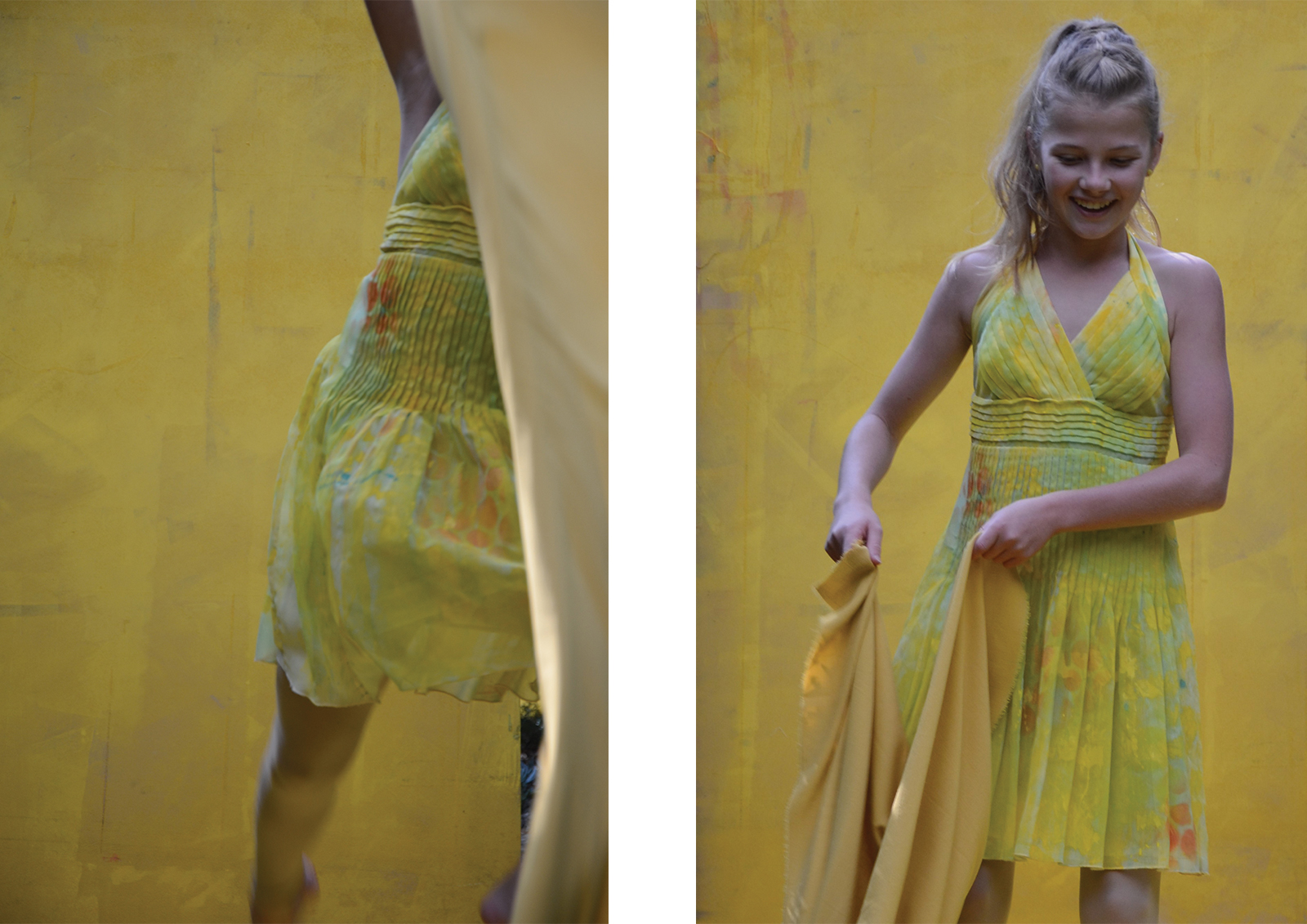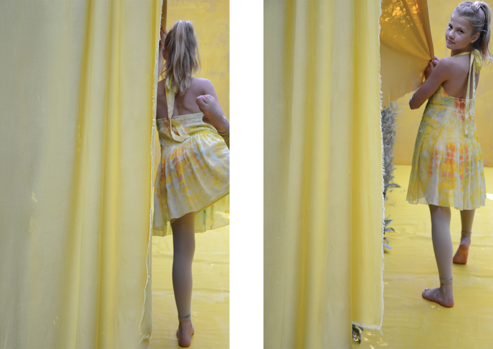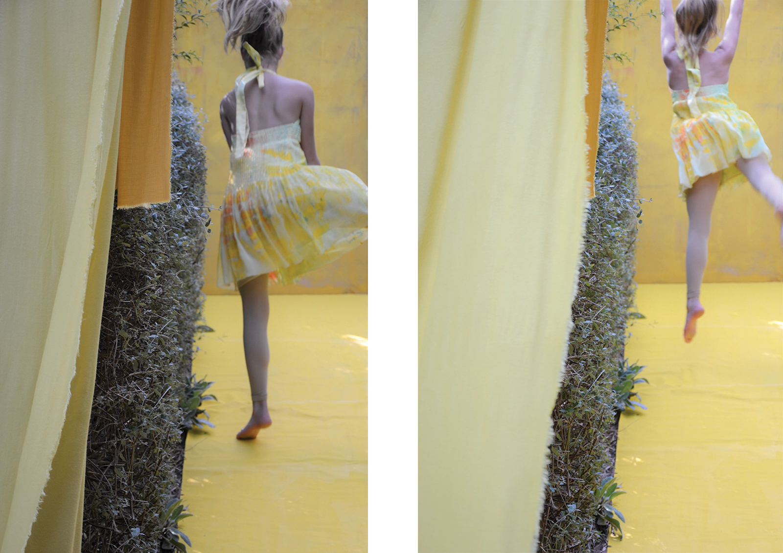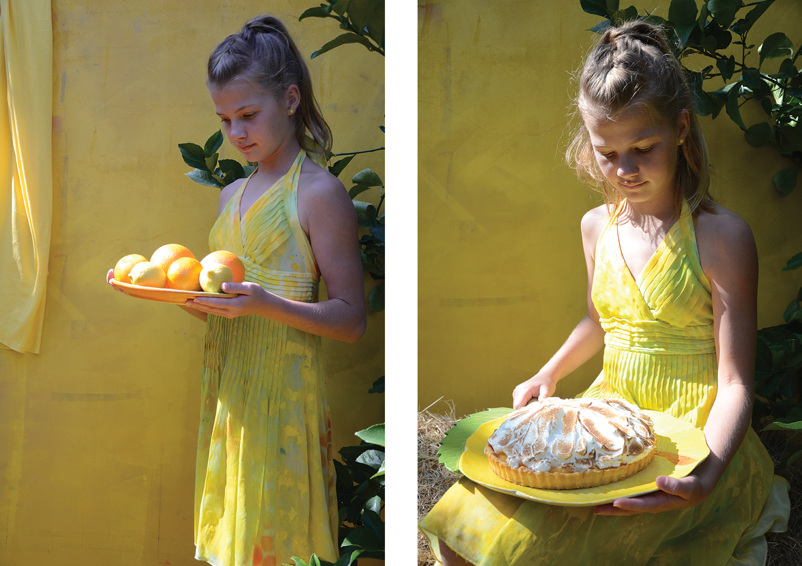 A unique garden room designed to evoke a mood of joy, happiness and energy. To articulate this mood, a colour palette of bright yellow, mid orange and light sky blue was selected. Distinct focal points are placed within the garden to add interest, draw the viewer in and up the pathway. These focal points are surrounded by established citrus trees – lemon, orange, mandarine, kumquat and lime, under-planted with everlasting daisies and succulents, and the pathway hedged with silvery stemmed bush germander. The visual story is of a gifted dancer who, on entering the garden is inspired to express her joy through dance and interactive play. The dancer is drawn up to the lineal bright yellow framed structure that invites the dancer in and to “follow the yellow brick road”. The frame and floor are draped with reclaimed, painted and natural dyed fabrics – these fabrics will be made into something beautiful. The fabric gently sways in the warm breeze waving the dancer in, where she runs, leaps, takes flight and twists her body with precision. Like a sweet, joyful bird, she interacts with the fabric, quick and fast movements up to and against the yellow textured wall. This is her stage. She is captured by a focal point, the hand-painted wall mural – an explosion of colour, botanical motifs, zesty circle slices, floating transparent balls, freshly squeezed paint and succulent greens. This visually stimulating artwork is yet another invitation to dance. Her soul delights as she gracefully and playfully moves rhythmically with the bubbles. Time to interact with the garden, as she places her happy face into the organic circular hole of the limestone sculpture, all set against a bright yellow textured wall. As the afternoon warm sun starts to filter, it is time to gather the citrus from the trees for home-baked delicious treats and to taste the lemon meringue pie – heavenly.